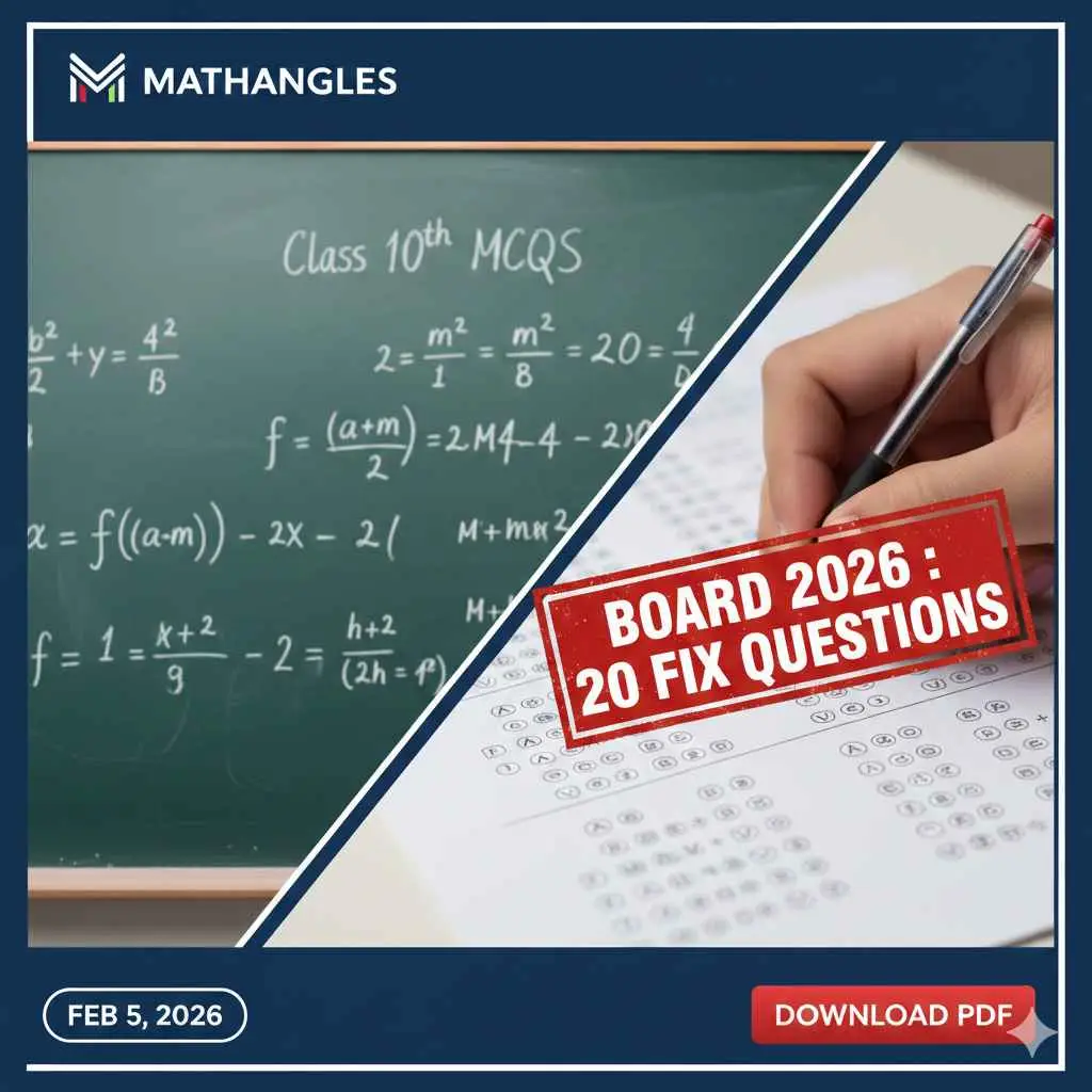 hello mere pyare baccho jaisa ki aap sab jante hai exam bilkul pas aa chuke hai date sheet aa chuki hai isliye mai Class 10 Maths MCQ Questions for Board Exam 2026 ko leke aa gya hu kyuki board Exams mein MCQs ka roll bahut bada hota hai. Yeh woh section hai jahan aap 100% marks score kar sakte hain bina zyada waqt gawaye. Maine apne 12+ saalon ke anubhav se Class 10th Maths ke poore syllabus mein se aise 20 sawal chune hain jo har saal kisi na kisi roop mein Board Exam mein puche jate hain.